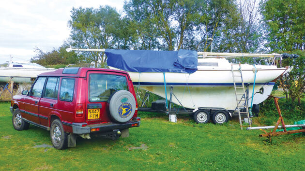 James Gibbs’s Varne Folkboat, Free Spirit, and his Land Rover Discovery tow vehicle. Photo: James Gibb.