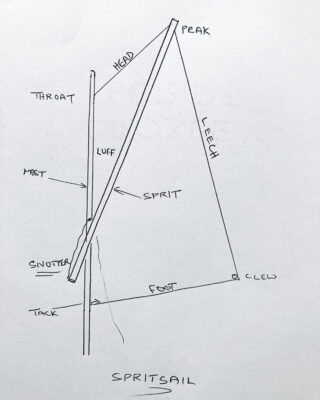 To get the best out of the sail to windward it is necessary to keep the snotter tight, it has a way of working loose and needs regular adjustment which is all part of the fun. The sketch demonstrates the essential parts of a sprit rig.