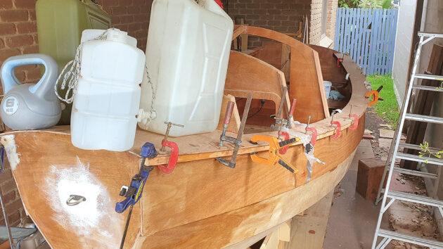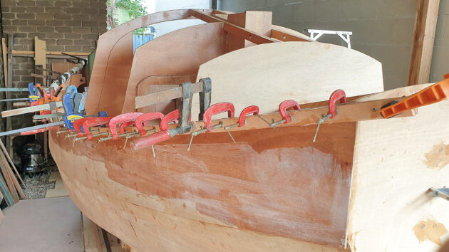 9. Once the carlins and gunwales are set, the deck can be fitted and epoxied into place. Extra cleats are added to the bulkheads to receive the cabin sides. This step went well thanks to CNC precision; only a bit of shaping with a plane required. With the decks on, the cabin sides slot in nicely, and with a bit of gentle persuasion the cabin top can be bent on over the bulkheads and is glued and screwed. The side coamings are bent into place and glassfibre laid over the cabin top.