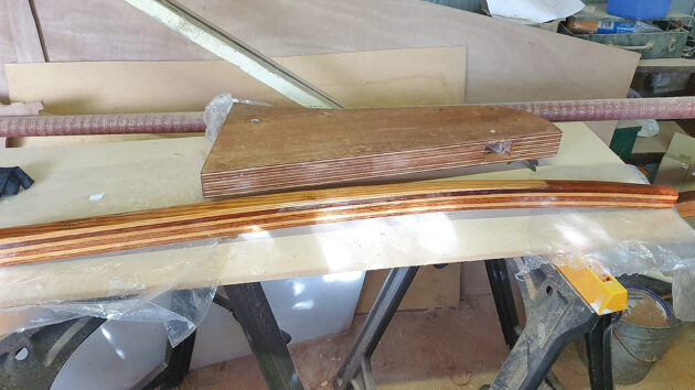 8. I found creating the SCAMP’s attractive stem to stern curve to be the hardest step. Both carlins and gunwales are made up of laminations of 20x30mm clear stock, and that curve will find any knots or imperfections in your wood! After snapping two, I chose my stock more carefully, and used my wife’s garment steamer, a movable sleeve of plastic, and every clamp I could find, to bend the pieces into the required shape.