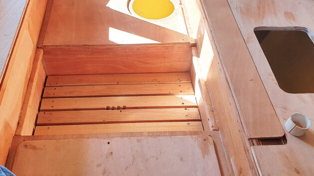 7. It’s decision time for the layout of your hatches, and whether you are going for the optional footwell. I chose the footwell, and made a floor grate out of hardwood, which can be raised to floor level for sleeping. Top of this picture, the round hole with yellow paint, is the water ballast tank and, to the right, the cap for the off-centre centreboard case. The seat tops and cockpit sole pieces and doublers are epoxied in place.