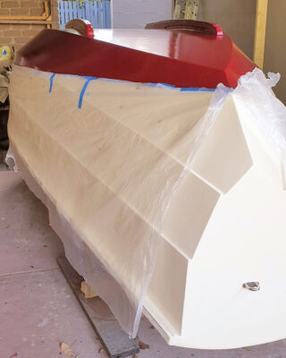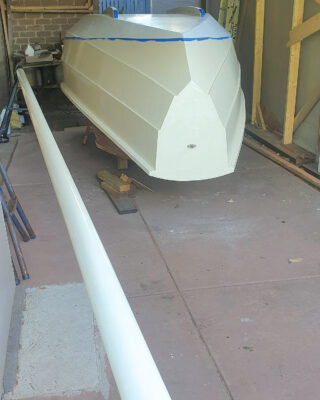 Bottom complete, the boat was turned right way up again, and the topsides finished off. This was also the time to get the mast, spars, foils and rudder done and add on all the hatches, cleats and fittings.