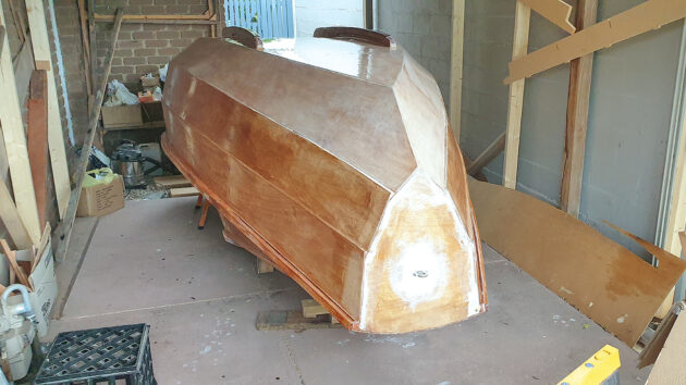One glorious day I lowered the boat onto a makeshift trolley and wheeled it out into the sunlight. I was ecstatic. Oz managed to contain his enthusiasm.