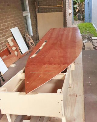 3. Build the jig. The rocker in the SCAMP’s bottom panel is created by screwing the bottom piece onto the jig. The plans set out the curve precisely, so you can make the jig from scratch, or if you have the CNC files, the pieces are cut out of MDF and slot together. I was working on a concrete floor, so I laid down a couple of pieces of construction ply, both to help with getting everything level and square, and to screw everything down so it did not move around over the build – a great tip given by legendary SCAMP sailor Howard Rice.