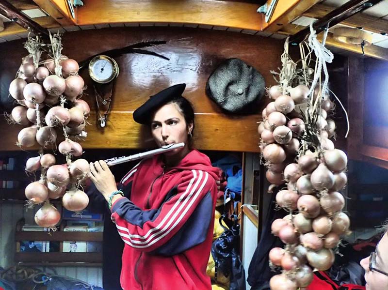 They lived and worked on the farm near l’Aberwrach in Brittany, taking part in the harvest, then transported a tonne of produce to the boat, sailed to Falmouth and sold the onions on the street asking for donations, while also performing music, dance and theatre shows.