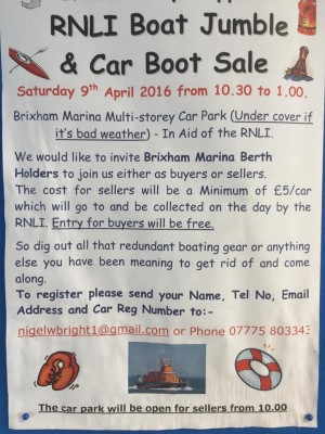 RNLI Boat Jumble & Car Boot Sale at Brixham Marina Multi-Storey Car park on Saturday 9th April 2016 from 10.30-13.00. All Brixham Marina Berth Holders are invited as either buyers (free) or sellers – minimum cost £5/car which will go to the RNLI. To register your interest please send your name, tel no, email address and car reg no to: nigelwbright1@gmail.com or phone 07775 803343