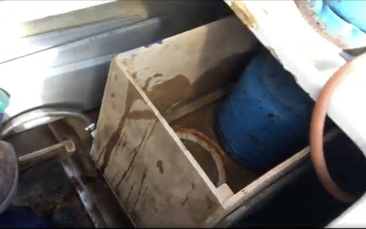 Ben also takes a look at the sink unit, but it takes him a while to find the seacock as the discharge hose runs across the galley. After removing the saucepans from one cupboard, he finally finds it in the bottom drawer. It’s an old-fashioned sluice valve and is completely seized.