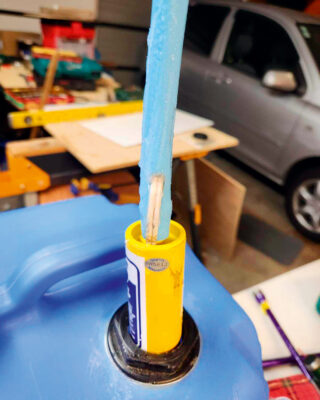 There was sufficient clearance between the joiner fitting and the cap to allow the cap to rotate and for the container to breathe, but not big enough to allow it to leak as the water sloshed about. (I used 32mm nylon plumbing fittings but the water pump will fit through the original filling hole of the 25lt container).
