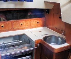 It’s also important to make sure all heavy items will stay in place even if the boat is knocked down by a wave. For offshore sailing everything should also be able to withstand a complete inversion with heavy items remaining in place. This means under-bunk lockers need lids that can be secured, while removable netting to keep everything in place in galley or saloon shelves can be important.