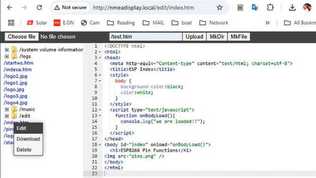 The ‘SD file access’ takes you to an editor. This allows easy access to the ‘config.txt’ file that allows setting of the wifi service set identifier (SSID), password or UDP port and other settings.
