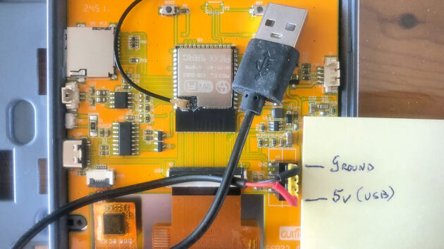 My first tests used a simple USB-A to USB-C cable plugged into a convenient USB socket near the instruments (the same cable I used to initially program the board). Later, I connected another two-wire USB cable to the small socket on the back of the display, simply connecting the USB 5V and Ground.