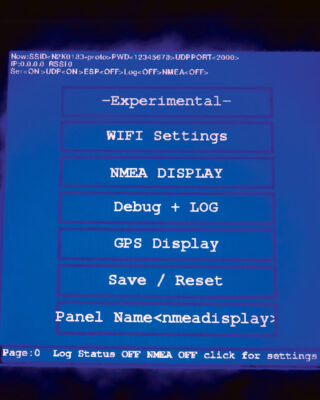 To set up the wifi and other options, touch the bottom row of the screen to find a page that allows you to set wifi settings, (using a keyboard as before) and then access other features. These settings pages include a debug screen where you can check the incoming NMEA data.