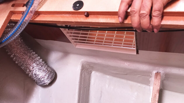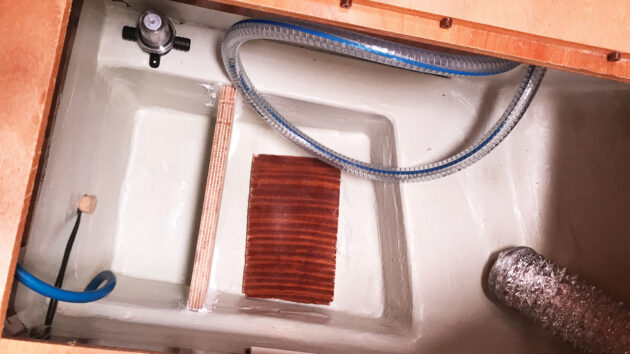 The discharge hose was then routed through the existing galley thru-hull fitting, simplifying plumbing and avoiding drilling yet more holes in the hull.