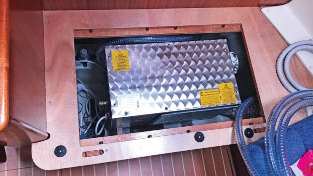 Thanks to the design of the Bavaria 38, the IZY system integrates seamlessly using existing elements including the ventilation holes already present in the hull interior, the accessible compartments under seats and floorboards, and a pre-existing galley thru-hull fitting used for seawater discharge.