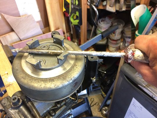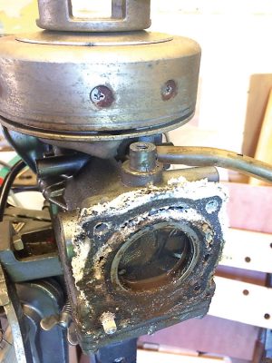 A sharp tap with a softwood punch and a hammer moved the piston a few millimetres. Not wanting to force things, I added more penetrating oil and left it to do its work for another 24 hours, before returning. A few more days in this vein and, eventually, with the encouragement of a large screwdriver used as a lever on the flywheel, the piston moved its full travel from top to bottom and back again. The engine was unseized!