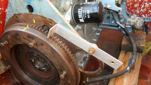 Charles fashioned a simple flywheel locking tool to undo the very tight flywheel bolts and front pulley nut. Photo: Charles Beddingfield.