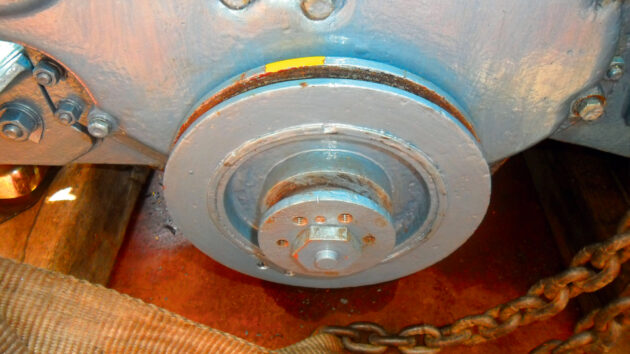 While the engine was away at the machine shop, I cleaned and repainted all the ancillaries, ordered additional parts such as a timing chain, water pump and hoses, and when the engine came back I refitted everything before trailering the refurbished engine, resplendent in new paint, back to the boatyard where Steve craned it back aboard for me.