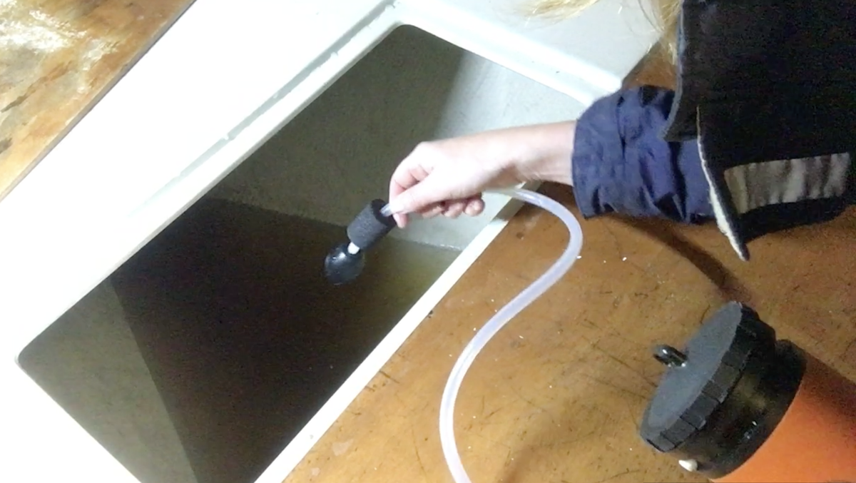 I pulled the float down to the end of the hose to keep the nozzle afloat at the top of the water, where it would be ‘freshest’.