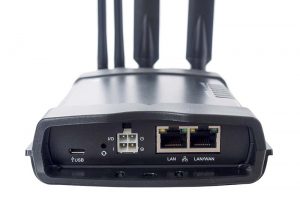 It has two Wi-Fi antenna plugs, two cellular antenna sockets, a GPS socket, a SIM card tray and a Micro-SD card slot, plus sockets for the power input, micro-USB, one LAN and one LAN/WAN port. The bulkhead-mountable unit has an LED indicator panel on the front including a five-bar signal strength meter. It comes with four antennae, but the GPS receiver and external antennae are optional.