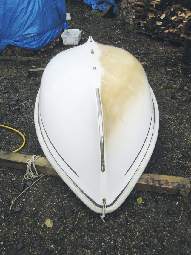 Daria Blackwell uses a 'miracle' product to clean a heavy yellow stain from a fibreglass dinghy