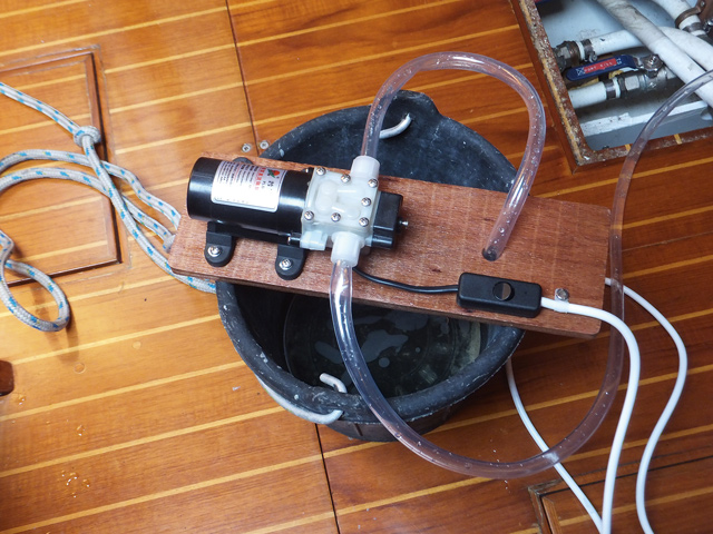 Norman Eastwood assembles a bucket pump to remove the final few bits of water from his boat’s bilges