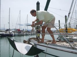 I often sail single-handed and picking up mooring buoys can be awkward, so I’ve constructed a lasso line to help. It consists of a 1m length of 6mm chain with…