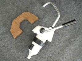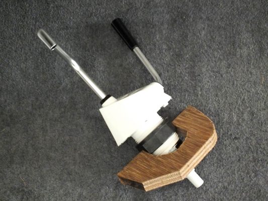 There was ’t enough room for any of my tools, either. I could just reach the nut but not turn it with my fingers so I made up a plywood spanner just small enough to fit in the limited space yet big enough for me to get the leverage to turn the plastic nut, job done.