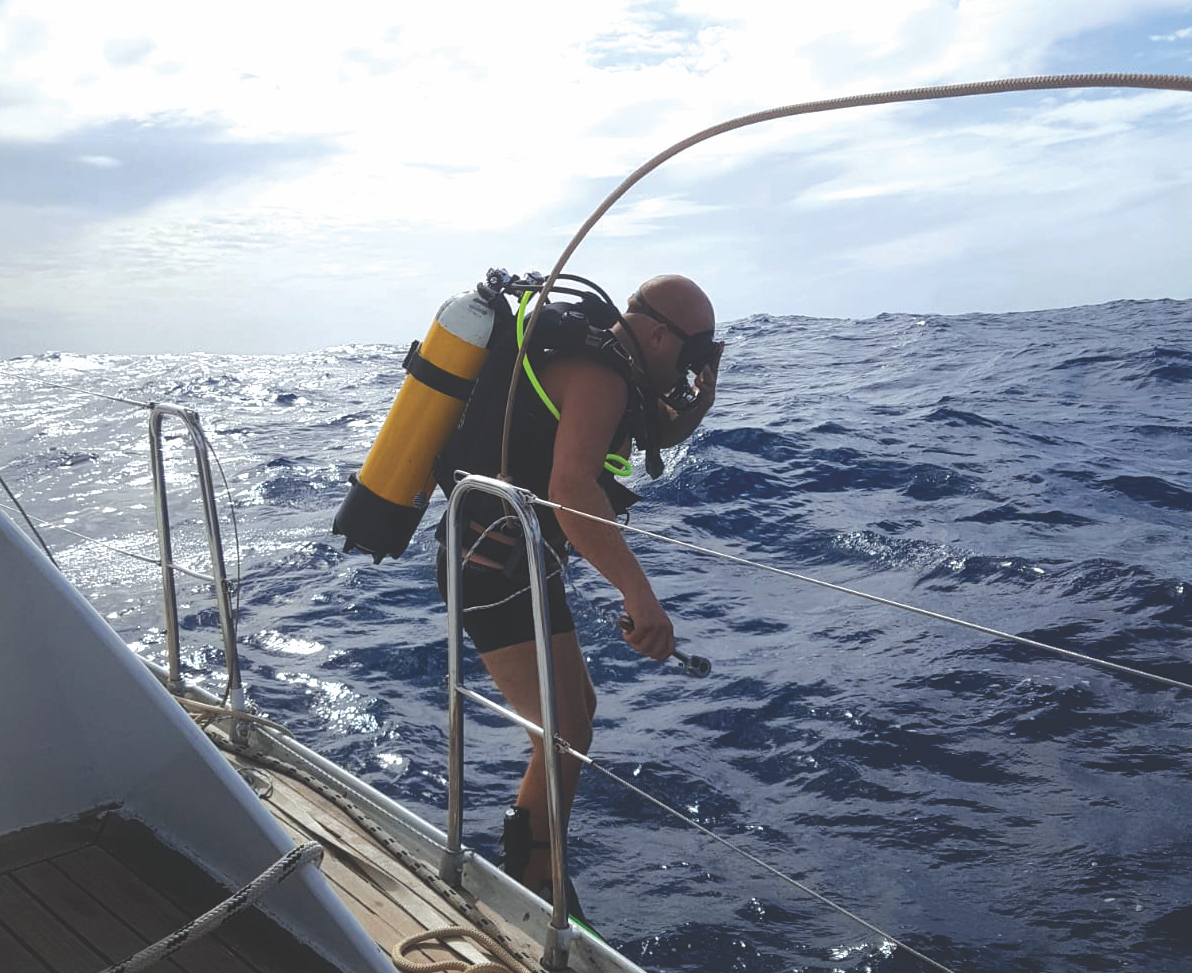 When a repair to a cracked skeg leads to steering failure on an ocean crossing, dad Jarmo Lohikari dives under the hull in big swells to fix it