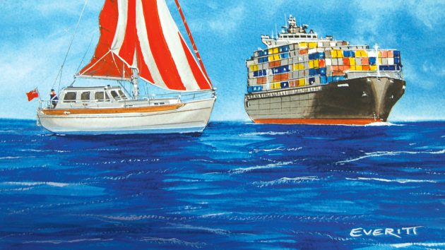 Then I noticed the container ship on my quarter, coming along the channel ahead of me. I knew I’d have to let her through, reinforced by the blasts from her horn. I gybed and lay her hove-to on the other tack while the ship plodded ponderously along.
