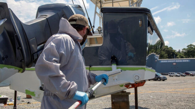 The sun’s harmful rays degrade the boat’s skin, in a manner of speaking, so that the shade of paint that originally graced the hull’s topsides may have faded or even become blotchy in places with the passage of time.