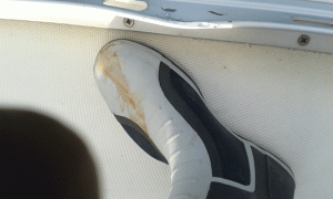 Daria Blackwell uses a 'miracle' product to clean a heavy yellow stain from a fibreglass dinghy